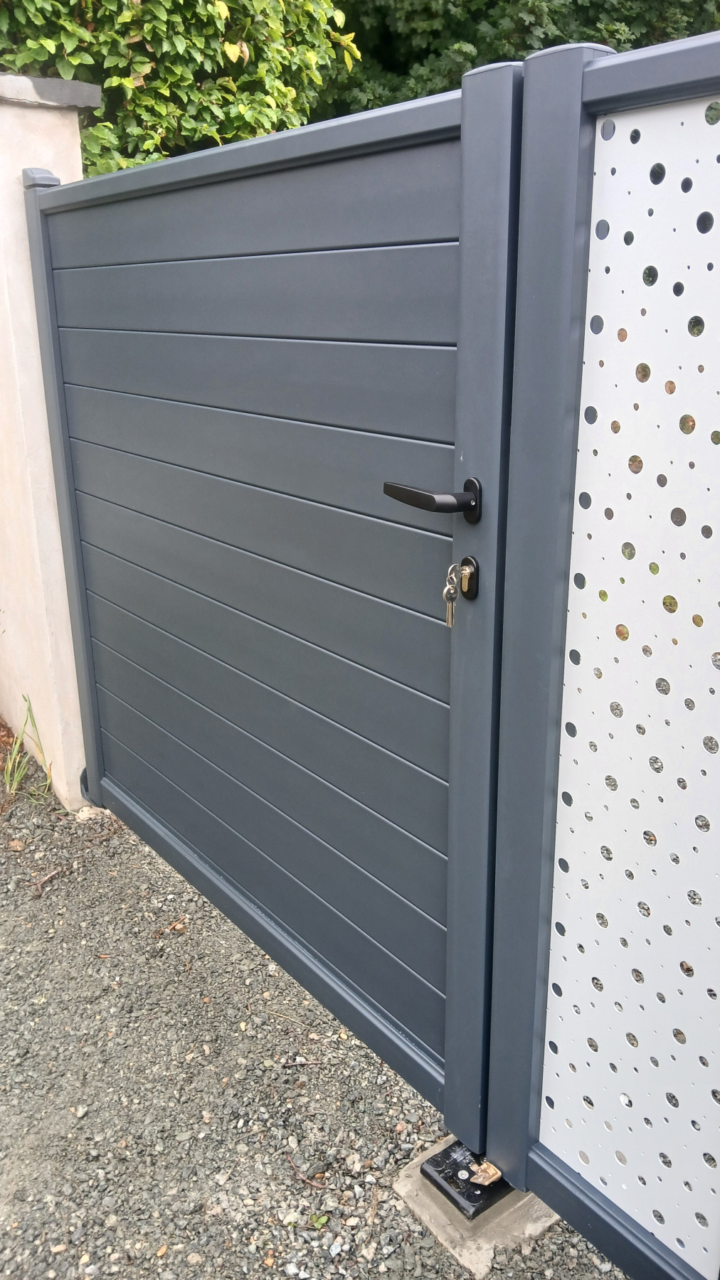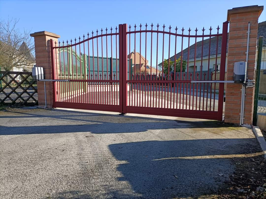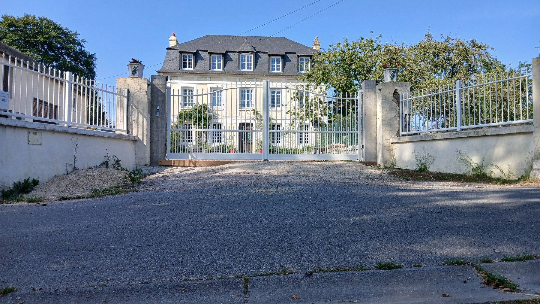 Portail battant 2 vantaux motorisé sur pente de façade.